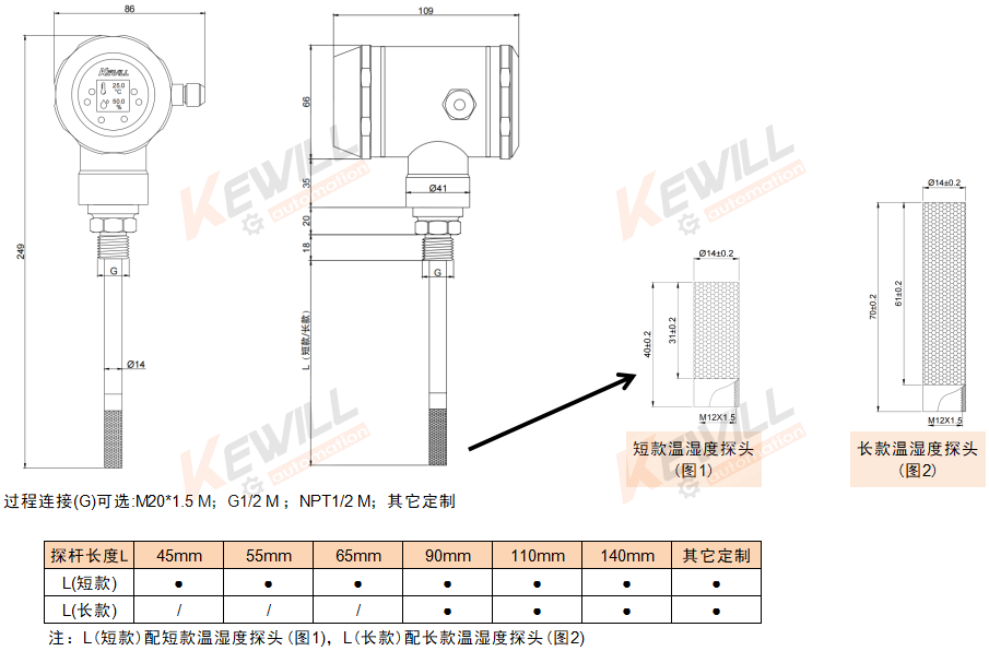 量程與精度 測(cè)量范圍: 溫度:-40℃…125℃內(nèi)可選 濕度:0%…100%RH 測(cè)量精度: 溫度:0.1℃(25℃) 濕度:±2%(25℃) 探桿直徑與耐壓: 探桿:Φ14? 耐壓:16bar 溫濕度探頭款式: 短款;長款 探桿長度????? (含探頭): L短款:45mm;55mm;65mm;90mm;110mm;140mm L長款:90mm;110mm;140mm 其它定制 重復(fù)性: 溫度:0.1℃;濕度:0.2%RH 響應(yīng)時(shí)間: 溫度:2s;濕度:8s 供電與輸出 供電: 18…36V DC 電氣連接: Cable gland格蘭頭.M14*1.OD:6mm 其它定制 線纜規(guī)格: 2m;5m;可定制 輸出信號(hào)(含通訊): 兩路晶體管開關(guān)量輸出 4…20mA+兩路晶體管開關(guān)量輸出 兩路晶體管開關(guān)量輸出+RS485 4…20mA+兩路晶體管開關(guān)量輸出+RS485 兩路晶體管開關(guān)量輸出: 兩路帶光電隔離的晶體管開關(guān)量輸出 外接電源<36VDC,導(dǎo)通時(shí)集電極最大電流<30mA 負(fù)載電阻(電流輸出): 0…750Ω 最大功率: 3W 材質(zhì)與防護(hù) 外殼材質(zhì): 不銹鋼1.4301(304) 膜片/芯片材質(zhì): 不銹鋼1.4404(316L) 過程連接材質(zhì): 不銹鋼1.4301(304) 溫度探桿材質(zhì): 不銹鋼1.4301(304) 濕度探桿材質(zhì): 顆粒銅鍍鎳+螺紋鐵鍍鎳 密封件材質(zhì): 氟素橡膠或指定 防護(hù)等級(jí): IP65 顯示類型: TFT-LCD液晶屏 顯示范圍: 溫度:-40℃…125℃ 濕度:0%…100%RH 顯示角度: 0°、90°、180°、270° 語言: 中文、英文 過程連接 過程連接(G): M20*1.5 M?;G1/2 M?;NPT1/2 M 其它定制 適用工況條件 環(huán)境溫度: ?-20℃…70℃ 環(huán)境濕度: 0%…80%RH 適用介質(zhì) 適用介質(zhì): 氣 符合接液材質(zhì)的其他介質(zhì)