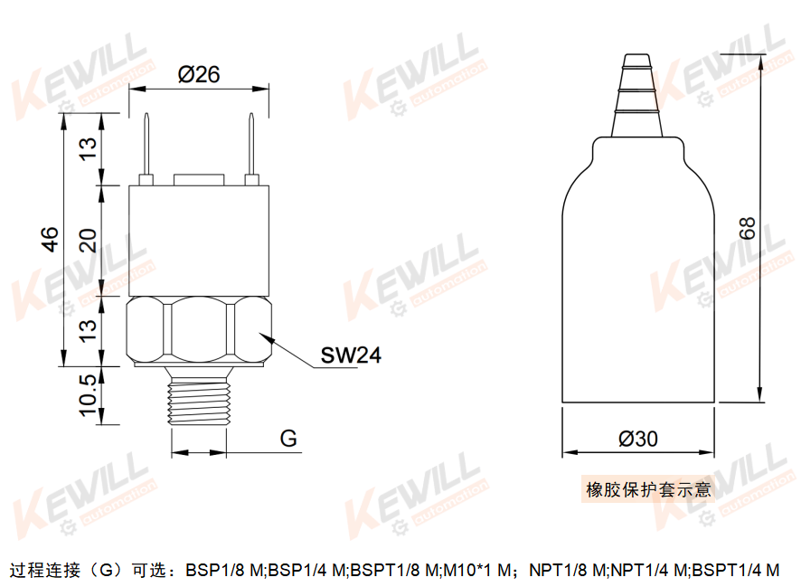 量程與精度 可調(diào)范圍: -0.8…0.15bar;0.2…2.5bar…50…400bar 最大允許過壓: 25bar;150bar;300bar;400bar;600bar 精度: 切換精度:20℃時(shí),刻度端值的5% 固定滯后值: 膜片執(zhí)行力:約為量程端值的10% 彈簧執(zhí)行力:約為量程端值的15% 重復(fù)性: 0.002 穩(wěn)定性: 0.0025 供電與輸出 負(fù)載: 最大負(fù)載:0.5A,AC250V 電氣連接: 6.3*0.8mm快接 執(zhí)行元件: 彈簧:耐壓高,靈敏度低 膜片:靈敏度高,耐壓低 開關(guān)與設(shè)定值狀態(tài): 常閉NC,低點(diǎn)報(bào)警(壓力降至低點(diǎn)設(shè)定值動(dòng)作斷開) 常開NO,低點(diǎn)報(bào)警(壓力降至低點(diǎn)設(shè)定值動(dòng)作接通) 常閉NC,高點(diǎn)報(bào)警(壓力升至高點(diǎn)設(shè)定值動(dòng)作斷開) 常開NO,高點(diǎn)報(bào)警(壓力升至高點(diǎn)設(shè)定值動(dòng)作接通) 電觸點(diǎn)材質(zhì) 鍍銀;鍍金 開關(guān)頻率: 90個(gè)循環(huán)/分鐘/ 機(jī)械壽命: 在20℃,70bar(1000psi)下100萬次循環(huán) 操作點(diǎn): 通過內(nèi)部螺絲調(diào)節(jié) 過程連接 過程連接(G): BSP1/8 M;BSP1/4 M;BSPT1/8 M;M10*1 M NPT1/8 M;NPT1/4 M;BSPT1/4 M 材質(zhì)與防護(hù) 本體材質(zhì): 不銹鋼1.4404(316L) 過程連接材質(zhì): 不銹鋼1.4404(316L) 密封件材質(zhì): 丁腈橡膠(NBR);氟橡膠;聚四氟乙烯(PTFE) 防護(hù)等級(jí): IP54 防護(hù)帽: 丁腈橡膠(NBR) 保護(hù)帽防護(hù)等級(jí): IP54 重量(約.實(shí)物為準(zhǔn)): 58.4g 適用工況條件 介質(zhì)溫度: -25…85℃ 適用介質(zhì) 適用介質(zhì): 水;氣;油 符合接液材質(zhì)的其他介質(zhì)