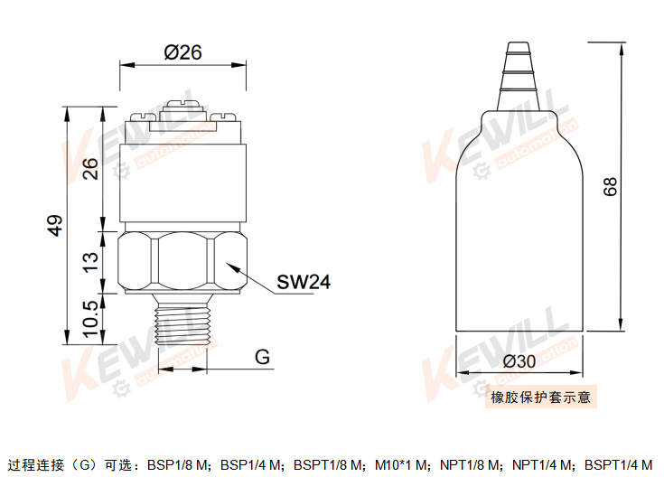量程與精度 可調(diào)范圍: 1…12bar…50…400bar 最大允許過(guò)壓: 300bar;400bar;600bar 精度: 切換精度:20℃時(shí),刻度端值的5% 固定滯后值: 彈簧執(zhí)行力:約為量程端值的10% 重復(fù)性: 0.20% 穩(wěn)定性: 0.25% 供電與輸出 負(fù)載: 最大負(fù)載:0.5A,AC250V;0.15A,DC110V 電氣連接: 壓線螺絲接線 執(zhí)行元件: 彈簧:耐壓高,靈敏度低 開(kāi)關(guān)與設(shè)定值狀態(tài): 常閉NC,低點(diǎn)報(bào)警(壓力降至低點(diǎn)設(shè)定值動(dòng)作斷開(kāi)) 常開(kāi)NO,低點(diǎn)報(bào)警(壓力降至低點(diǎn)設(shè)定值動(dòng)作接通) 常閉NC,高點(diǎn)報(bào)警(壓力升至高點(diǎn)設(shè)定值動(dòng)作斷開(kāi)) 常開(kāi)NO,高點(diǎn)報(bào)警(壓力升至高點(diǎn)設(shè)定值動(dòng)作接通) 電觸點(diǎn)材質(zhì) 鍍銀;鍍金 開(kāi)關(guān)頻率: 90個(gè)循環(huán)/分鐘/ 機(jī)械壽命: 在20℃,70bar(1000psi)下100萬(wàn)次循環(huán) 操作點(diǎn): 通過(guò)內(nèi)部螺絲調(diào)節(jié) 過(guò)程連接 過(guò)程連接(G): BSP1/8 M;BSP1/4 M;BSPT1/8 M;M10*1 M NPT1/8 M;NPT1/4 M;BSPT1/4 M 材質(zhì)與防護(hù) 本體材質(zhì): 不銹鋼1.4404(316L) 過(guò)程連接材質(zhì): 不銹鋼1.4404(316L) 密封件材質(zhì): 丁腈橡膠(NBR);氟橡膠;聚四氟乙烯(PTFE) 三元乙丙橡膠 防護(hù)等級(jí): IP54 防護(hù)帽: 丁腈橡膠(NBR) 保護(hù)帽防護(hù)等級(jí): IP54 重量(約.實(shí)物為準(zhǔn)): 73.8g 適用介質(zhì) 適用介質(zhì): 水;氣;油 符合接液材質(zhì)的其他介質(zhì) 適用工況條件 介質(zhì)溫度: -25…85℃