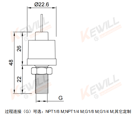量程與精度 測量范圍: 動作壓力值:-0.05…-0.08MPa 復(fù)位壓力:-0.025…-0.06MPa 誤差: ±0.005MPa 壓差: ≥0.25 耐壓: 1MPa 供電與輸出 電氣參數(shù): 120VAC 6FLA,40.2LRA;240VAC 4FLA,26LRA 120/240VAC 375VA;36VDC 3A 電氣連接: 護(hù)套線;18AWG線束;6.35*0.8插片 開關(guān)類型: 常閉;常開 使用壽命: ≥30000 過程連接 過程連接(G): NPT1/8 M;NPT1/4 M;G1/8 M;G1/4 M 其它定制 適用工況條件 環(huán)境溫度: -20…65℃ 介質(zhì)溫度: -35…120℃ 材質(zhì)與防護(hù) 外殼材質(zhì): PA66塑膠 過程連接材質(zhì): 黃銅;不銹鋼1.4301(304) 防護(hù)等級: IP65;IP67(灌膠款) 重量(約.實物為準(zhǔn)): 52g 適用介質(zhì) 適用介質(zhì): 空氣、水、制冷劑、機(jī)油、潤滑油 其它類似碳?xì)浠衔?/td> ?