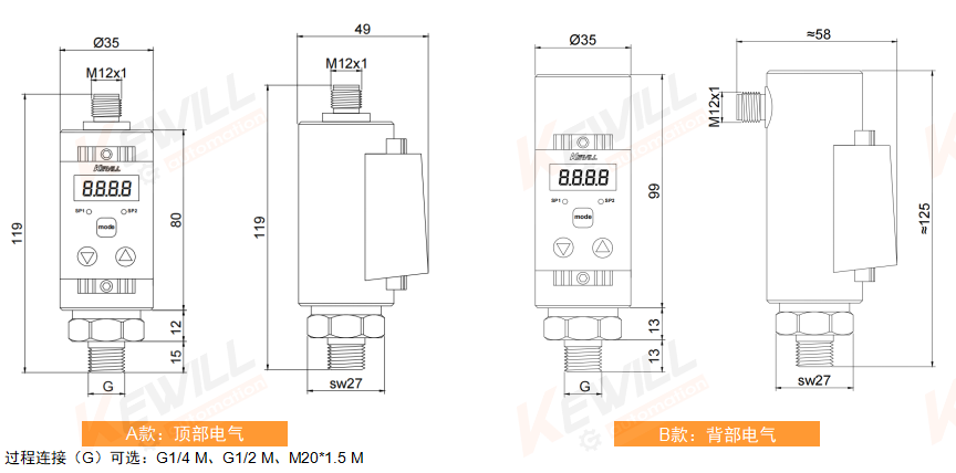 量程與精度 測量范圍: 見量程代碼(負(fù)壓、混合壓、微壓、常壓) 過載范圍: ≤1bar, 3×;≤10bar,2×;≤1000bar, 1.5× 精度: 輸出精度:±0.25%(R);±0.50% 顯示精度±0.1%;控制精度±0.1% 線性度: ±0.5%;±0.2% 重復(fù)性: ±0.1% 穩(wěn)定性: ±0.1% 溫度影響: <0.5% 響應(yīng)時間: ≤5ms 相對濕度: 20…60%RH 過程連接 過程連接(G): G1/4 M,G1/2 M,M20*1.5 M 供電與輸出 供電: 12…36VDC 負(fù)載: <24V 1.2A 電氣連接: 頂部電氣:M12*1航空插頭Aviation socket 背部電氣:M12*1航空插頭Aviation socket 線纜規(guī)格: 2m;5m;可定制 絕緣電阻: >100MΩ 最大功率: 1W 開關(guān)類型: 2路開關(guān)量(NPN/PNP) 開關(guān)壽命: >100萬次 材質(zhì)與防護(hù) 外殼材質(zhì): 不銹鋼1.4401(316) 膜片/芯片材質(zhì): 不銹鋼1.4404(316L) 過程連接材質(zhì): 不銹鋼1.4404(316L) 防護(hù)等級: IP65 顯示類型: LED數(shù)碼管屏(4位) 顯示范圍: -1999…9999 重量(約.實物為準(zhǔn)): 頂部電氣:332g;背部電氣:424g 適用工況條件 環(huán)境溫度: ?-20…70℃ 介質(zhì)溫度: -20…80℃ 適用介質(zhì) 適用介質(zhì): 水、氣、油 符合接液材質(zhì)的其他介質(zhì)