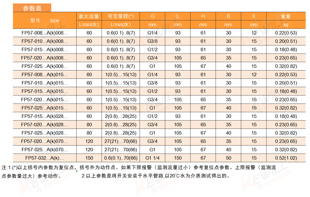 設(shè)定范圍: 詳見參數(shù)表 精確度: ±2.5%總量程 遲滯: 視開關(guān)點(diǎn)而定,最小0.5L/Min 開關(guān)設(shè)定刻度: 是在介質(zhì)為水,溫度20℃,水平安裝狀態(tài) 進(jìn)行標(biāo)定的安裝位置,介質(zhì)和溫度變化 會對開關(guān)值略有影響。 LED顯示: 有源DC24V均提供LED顯示開關(guān)狀態(tài) 流量顯示: 可現(xiàn)場顯示當(dāng)前瞬時(shí)流量趨勢。 接線方式: DIN端子接頭(DIN43650) 輸出: 無源干簧開關(guān),容量?24VDC / 230VAC 0.5A(3A特殊定制) 耐壓: 15bar(POM塑料) 50bar(鋁型) 50bar(青銅合金) 100bar(不銹鋼) 定制型200bar(可選) 平均壓力損失: 0.3bar(在25L/min) 介質(zhì)溫度: 最大90℃ 防護(hù)等級: IP65 FP57…FP材質(zhì): 柱塞:?POM工程塑料 彈簧:?316L不銹鋼?SUS1.4310 密封:NBR 磁體:??鋇 FP57…FA材質(zhì): 外殼:??陽極氧化鋁 柱塞:?POM工程塑料 彈簧:?316L不銹鋼?SUS1.4310 密封:NBR 磁體:??鋇 FP57…FK2材質(zhì): 外殼:?316L不銹鋼 柱塞:?POM工程塑料 彈簧:?316L不銹鋼?SUS1.4310 密封:NBR 磁體:??鋇 FP57…FB材質(zhì): 外殼:??青銅合金?UNI EN 12165 柱塞:?POM工程塑料 彈簧:?316L不銹鋼?SUS1.4310 密封:NBR 磁體:??鋇 ?