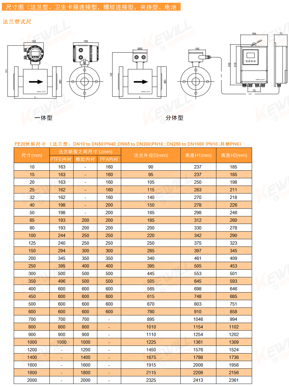公稱通徑(mm) 管道式四氟襯里:DN10~DN600 管道式橡膠襯里:DN40~DN1200(特殊規(guī)格可定制) 流動方向: 正,反,凈流量 量程比: 150:1 重復(fù)性誤差: 測量值的±0.1% 精度等級: 0.2%級&0.5%級 被測介質(zhì)溫度: 普通橡膠襯里:-20~+60℃ 高溫橡膠襯里:-20~+90℃ 聚四氟乙稀襯里:-30~+100℃ 高溫型四氟襯里:-20~+180℃ 額定工作壓力: